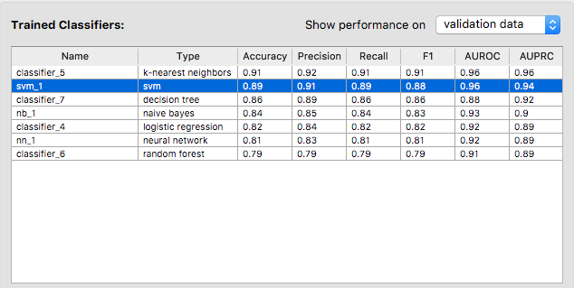 To select a classifier, you may let the software pick one for you by specifying a metric. In this case, the software will select the best classifier with respect to that metric. Otherwise, you may pick a classifier on your own. We let the software select the classifier with the highest accuracy.