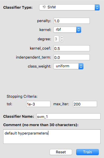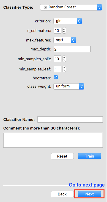 You may give your classifier a name and add a comment. If you do not specify a name, the software will use “classifier_[int]” as its default name. For example, if the classifier is the third one you trained, its default name is “classifier_3”.