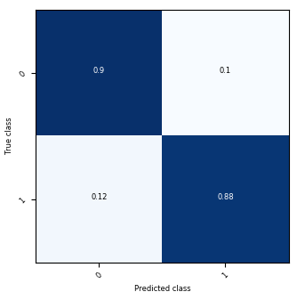 Shown on the left is a scatter plot of the training data and contours of the decision regions. The darker the color, the more confident the classifier is. Shown on the right is the confusion matrix.
