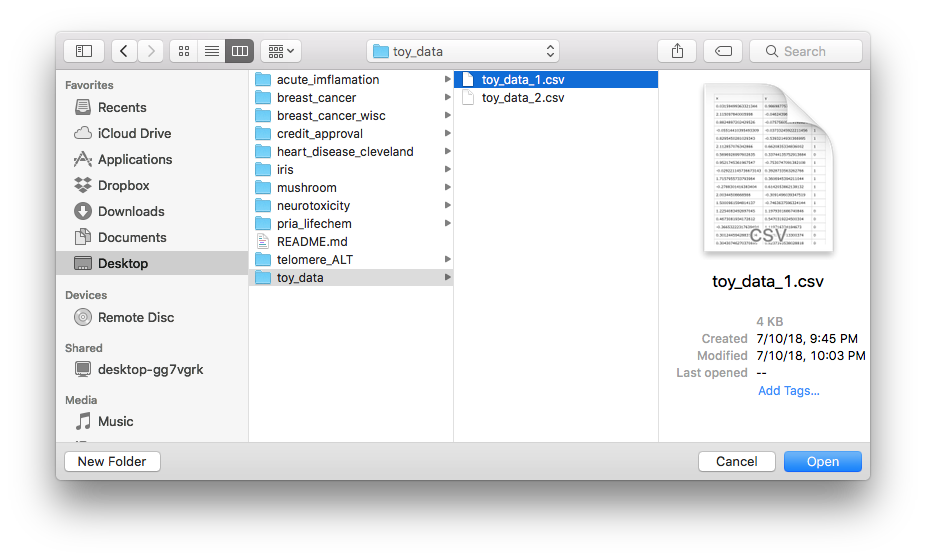 Load toy_data_1.csv file from the data/toy_data by clicking on Select File….