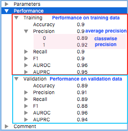 - Examine classifier summary. A summary of the newly trained classifier is presented in the blue area. As with data summary, you may unfold the bullets to see more details.