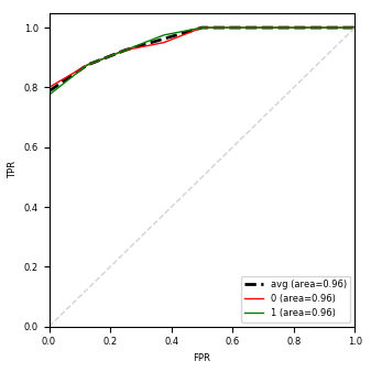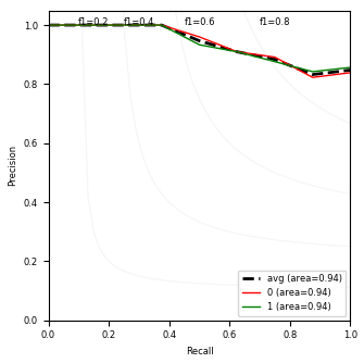 The left figure includes ROC curves and the right one includes precision-recall curves. A curve is plotted for each class. The average curve is the unweighted average of all classwise curves.