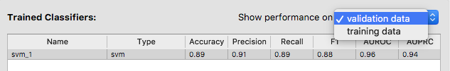 You may want to compare the classifier’s performance on training and validation data to see how well it generalizes. Use the drop-down menu at the top-right corner of the yellow area to switch between performance on different types of data. This is important to remember for the rest of the workshop.