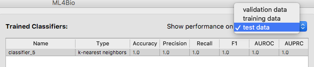 Although not recommended, you are allowed to test any of the other trained classifiers. Switch the type of data to either training or validation data and you will see the complete list of trained classifiers. Select a classifier and test it.