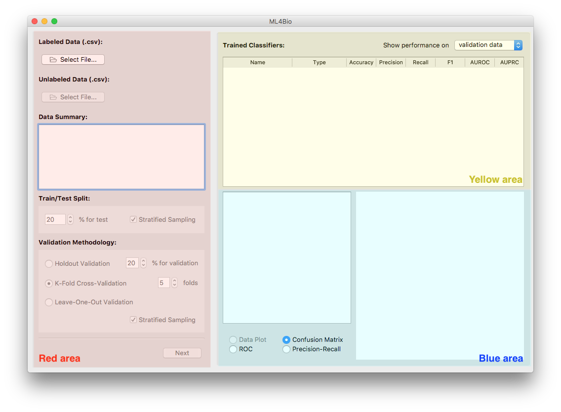 Red area. This is the main area you operate on. It consists of three pages. The first page allows you to load data, split data and choose a validation method. The second page is where you train classifiers. The last page is for testing and prediction.