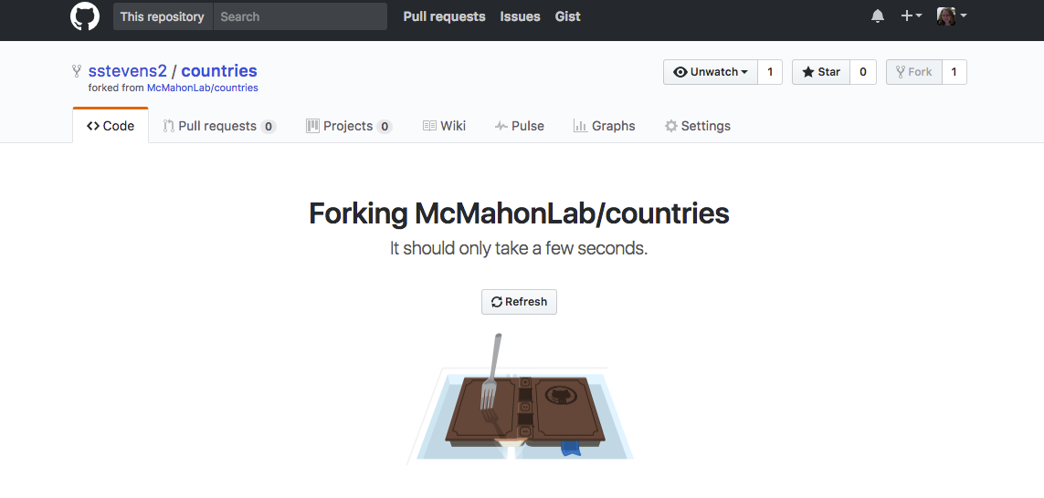 So that we can’t copy the command above and accidentally clone someone else’s version of countries to our computer, the command above uses the placeholder ‘USERNAME’ where you should put your own username if your copied from above instead of copying the link from your browser and pasting it into the command.